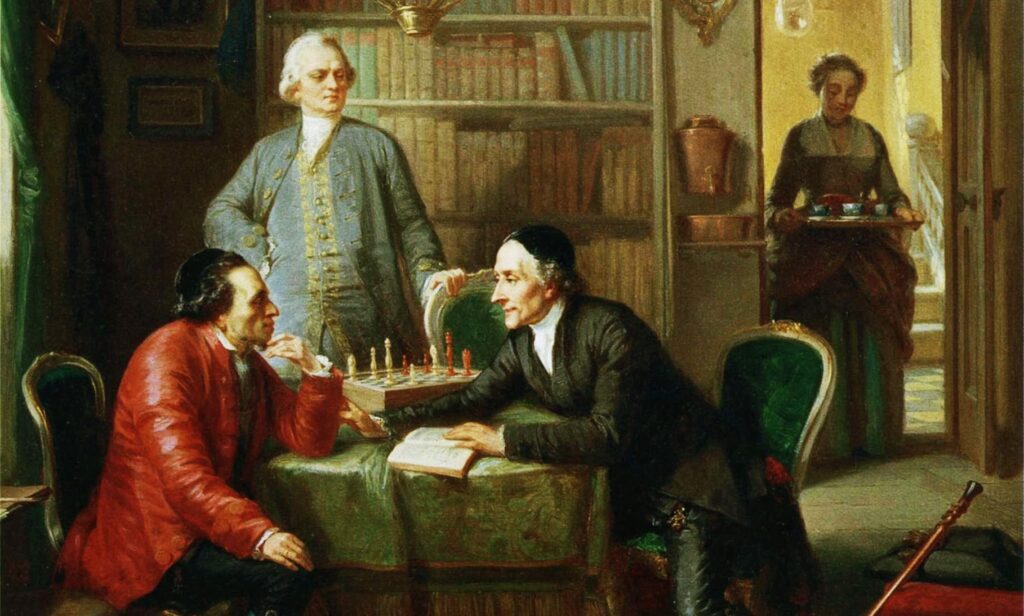 Moritz Daniel Oppenheim (1800–1882). Olje på lerret, 71,1 x 59,6 cm, Magnes Collection of Jewish Art and Life, University of California, Berkeley. De avbildede personer er sittende til venstre den jødiske filosof og kulturpersonlighet Moses Mendelssohn (1729-1786), sittende til høyre den reformerte sveitsiske teolog Johann Kaspar Lavater (1741-1801), og stående i bakgrunnen den tyske forfatter […]
