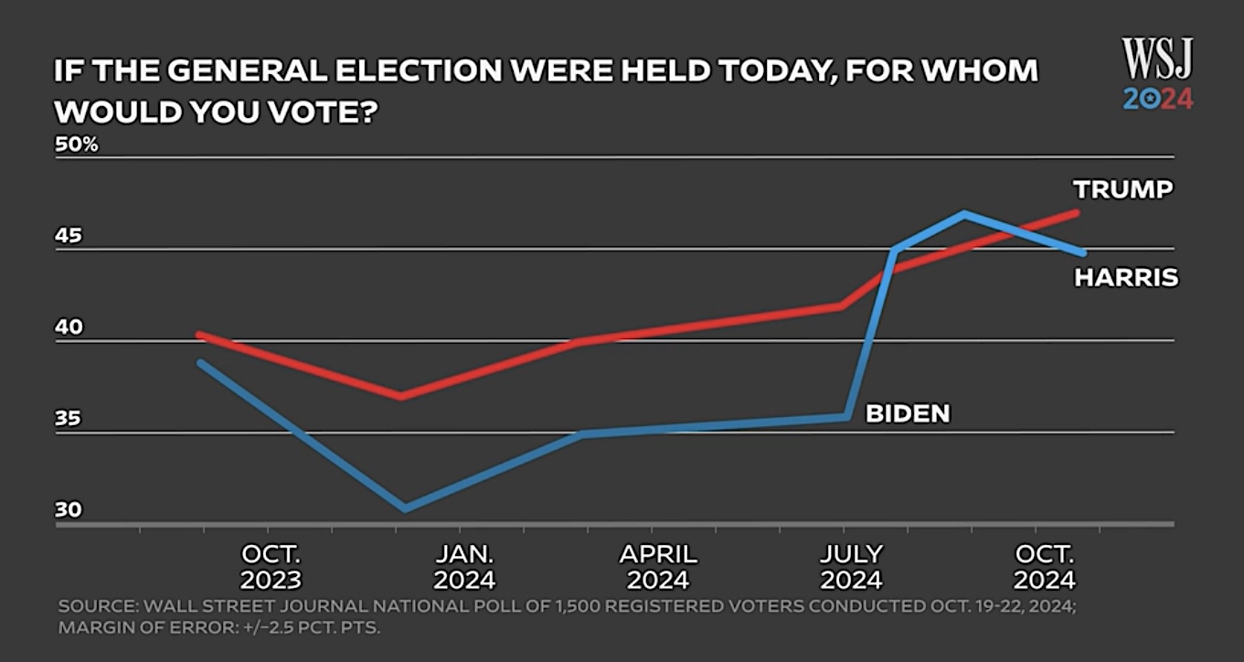 I en undersökning som Wall Street Journal nyligen genomfört där även andra kandidater beaktas får Trump stöd från 47 procent av de tillfrågade mot 45 procent för Harris.