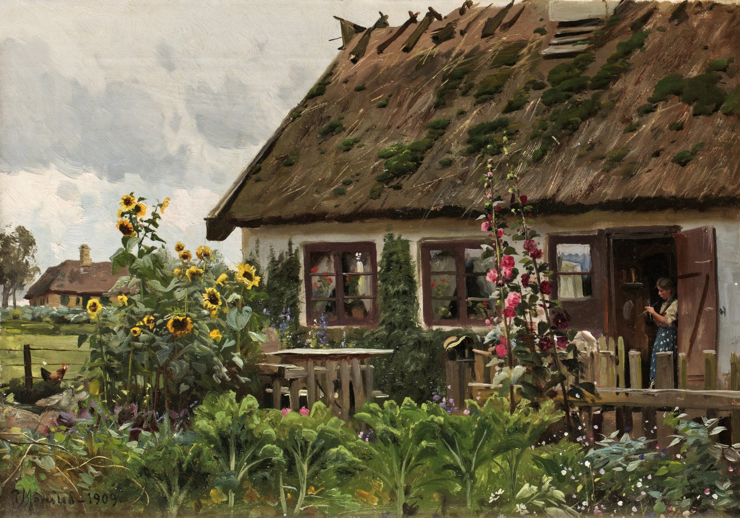 Peder Mønsted fant mange av sine motiver på den danske landsbygden, og her har han funnet et noe forfallent hus med strå-tak, men med en ganske frodig hage, hvor man kan gjenkjenne stokkroser, solsikker og hva som ser ut til å være det vi i Norge kaller grønnkål. Den unge dame i døråpningen virker helt konsentrert om sitt håndarbeide.