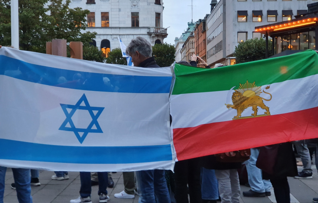 Israeliska och iranska flaggor under manifestationen. Foto: Document.