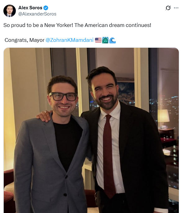 – Så stolt över att vara newyorkare! Den amerikanska drömmen fortsätter! Grattis, borgmästare Zohran Mamdani, skrev Soros och delade en bild på sig själv tillsammans med Mamdani.