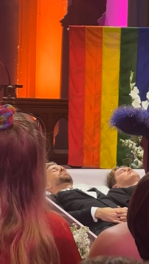 Begravningen kommer att innehålla tal, uppträdanden, dans och sång om de som begravs. Under kvällen var det det välkända gayduon Vegard Harm och Morten Hegseth som låg i kistan. Hegseth har tidigare gjort sig känd för grova uttalanden inför barn.