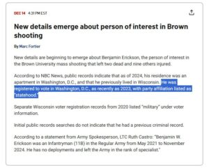 Detta diskuterades dock inte vidare i CNN:s rapportering eller andra liberala medier senare under dagen. Varken polisen eller andra myndigheter har bekräftat eller kommenterat informationen om väljarregistreringen. Offentliga register visar att han har bott i en lägenhet i Washington, D.C. sedan 2024.