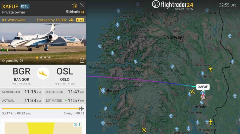 På onsdagskvällen, några minuter före midnatt, var fredspristagaren på väg över Hurdal till Gardermoen i ett privatflygplan av märket Embraer. Mer än 15.000 personer följde flygningen på FlightRadar24. Detta gjorde det till den mest följda flygningen i världen just då.
