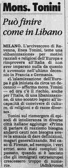 Redan 1990 pekade ärkebiskopen av Ravenna, Ersilio Tonini, på vår ”libanonisering”. ”Islamiseringen av Europa har pågått i ungefär ett decennium”, sade Tonini, ”och nu finns det en risk att även Italien kommer att libanoniseras.”
