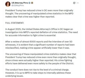Detta sammanföll med att president Donald Trump lanserade en federal insats för att bekämpa vad han beskrev som en ”brottsepidemi” i huvudstaden. Åtgärderna omfattade ett presidentdekret och insats av federala polisstyrkor, inklusive nationalgardet. Pirro hävdade att avslöjandena stärker presidentens påstående att brottsligheten har minskat mer än man tidigare trott: