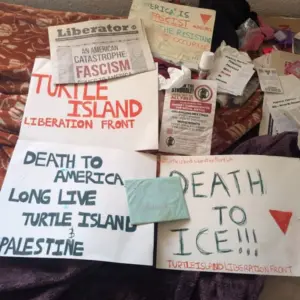 Efter arresteringarna genomsökte FBI-agenter hemmet hos en av ledarna och fann affischer med texten: ”Död åt Amerika. Länge leve Turtle Island och Palestina.”