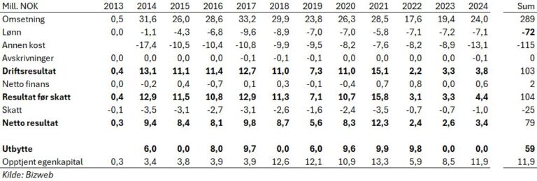 Företaget binder inte upp något kapital, och även med måttliga marginaler på 16–17 procent under 2023 och 2024 var avkastningen på kapitalet över 40 procent, vilket resulterade i en nettovinst på 2,6 respektive 3,4 miljoner norska kronor efter årliga löneutbetalningar på över 7 miljoner norska kronor.