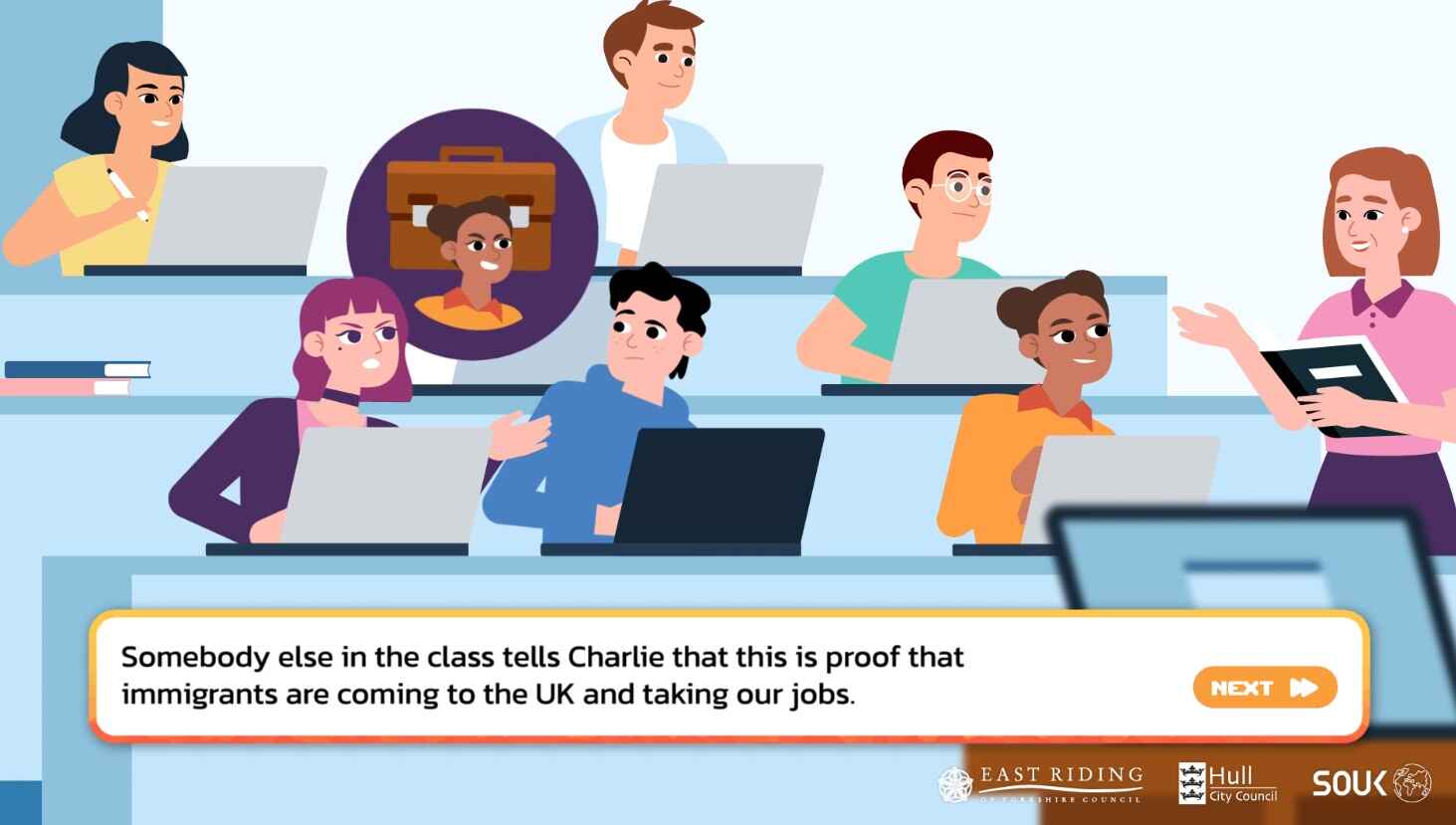 Immigranten, som hotar britterna på arbetsplatsen, illustreras som en smart, ung kvinna med annan hudfärg. Vi är på säker mark här, och Amelia är både dum och elak som säger så. Låt oss definitivt hålla oss borta från den enorma illegala invandringen i form av män i gummibåtar! Och låt oss inte tala om de kriminella aspekterna som britterna utsätts för.