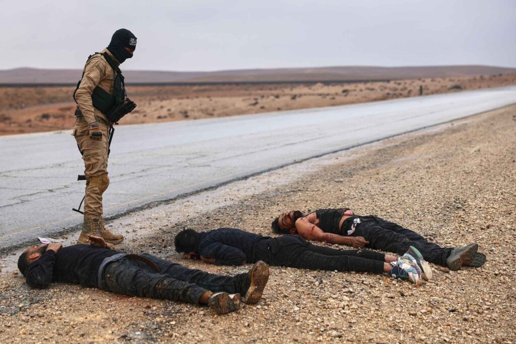 En syrisk regeringssoldat står bredvid kropparna av amerikanskstödda Syrian Democratic Forces (SDF) på en väg som leder till den strategiska staden Taqba i östra Syrien, under en pågående offensiv mot kurdiskledda styrkor, söndagen den 18 januari 2026. (AP Photo/Ghaith Alsayed)